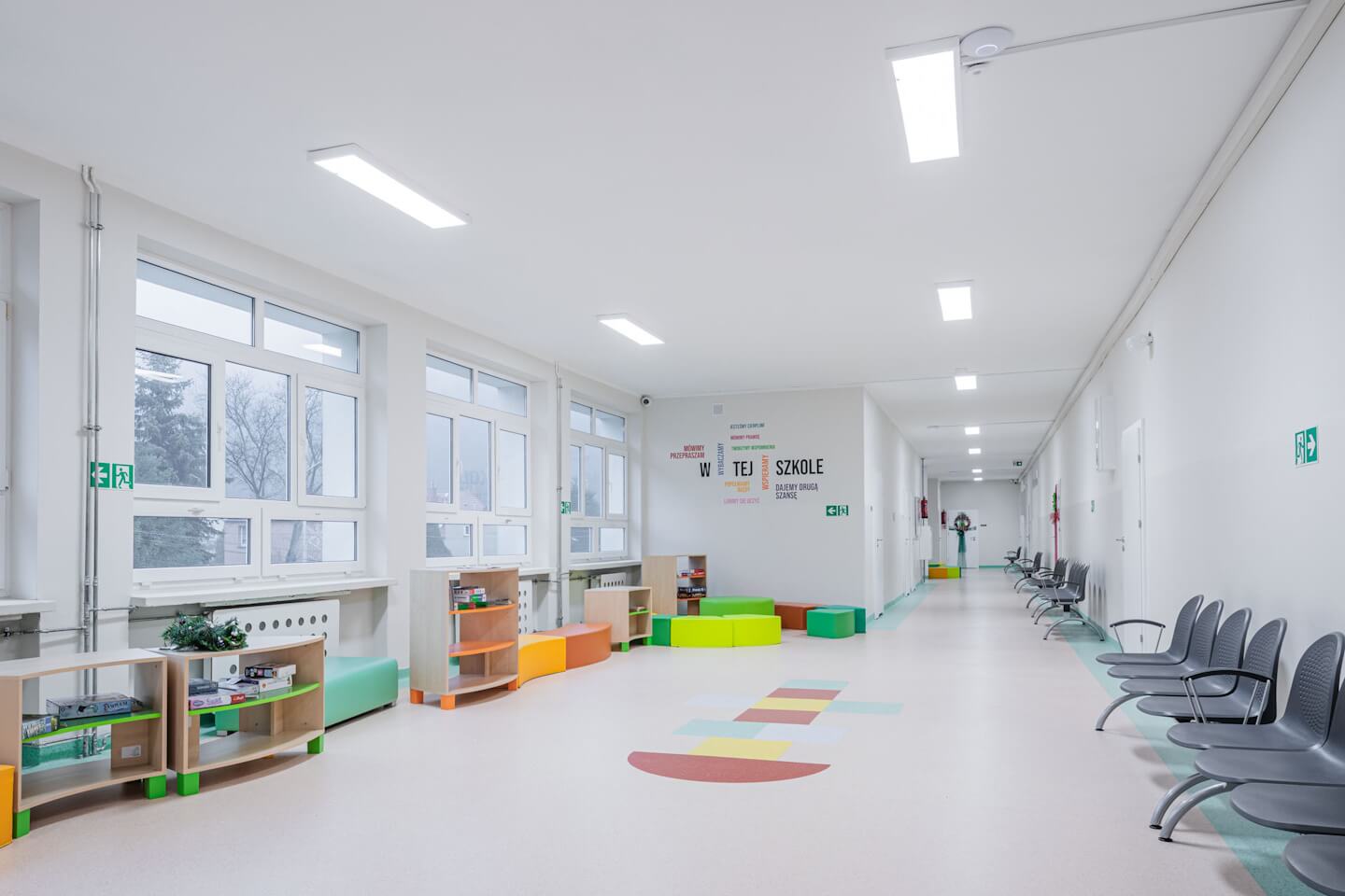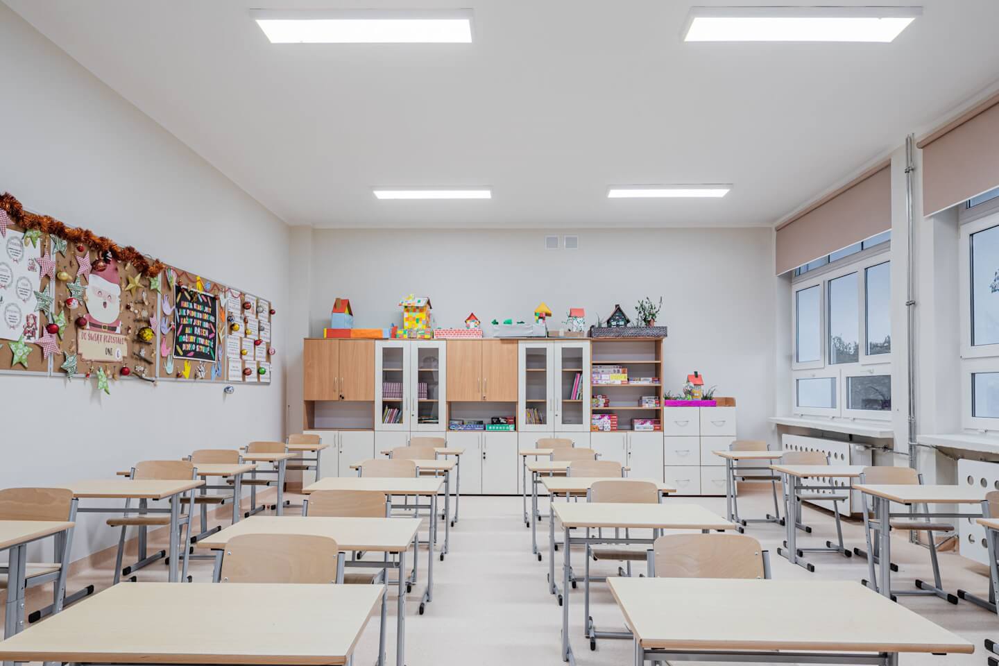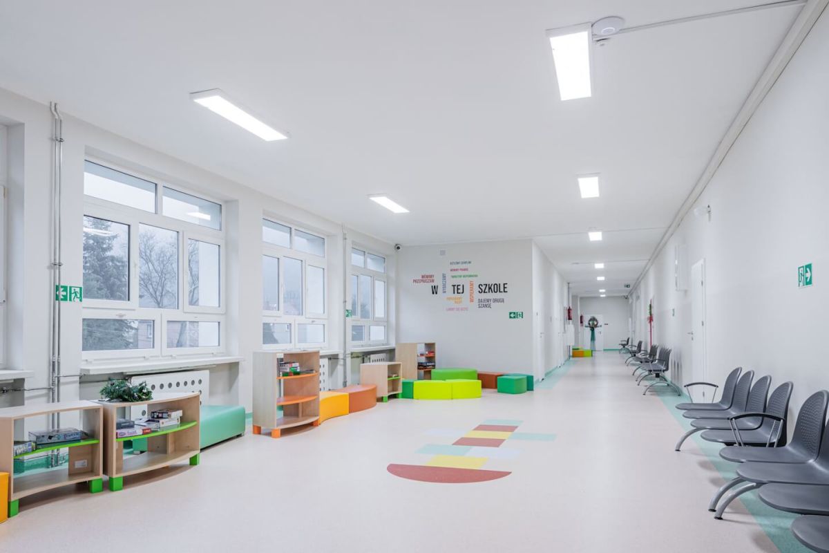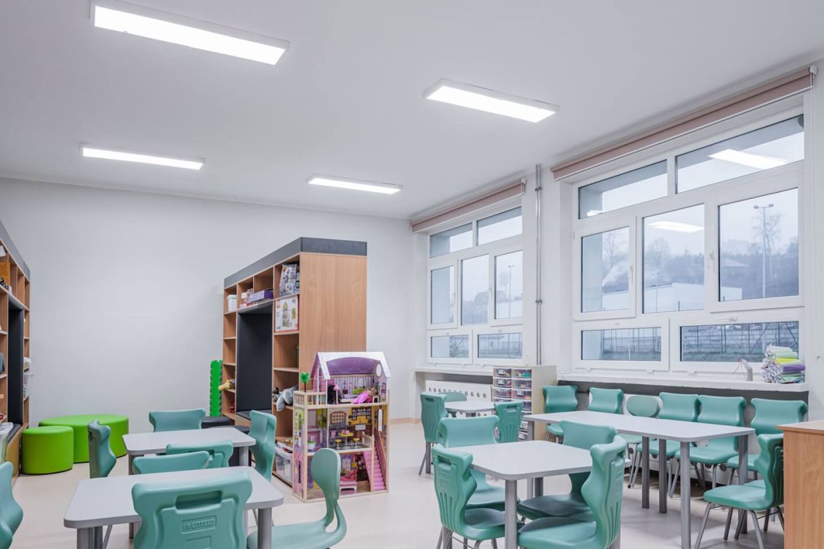 A modern educational space begins with good lighting. The school and preschool complex in Bardo is an example of a place that, after a difficult period, has gained functional and welcoming interiors that promote learning, movement, and daily activities for children. We provided energy-efficient lighting throughout the classrooms and gymnasiums, corridors, and common areas. We used intelligent SQ 1200 LED IoT luminaires and Dione LED lamps with motion sensors, which ensure uniform, eye-safe light – precisely where it's needed.