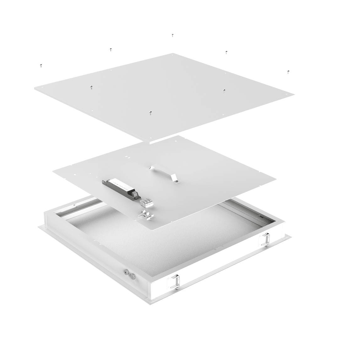 The front of the luminaire is made of aluminium and 4 mm thick tempered glass, resistant to impact (IK09 class) and chemicals. The modular shutter system (Glass / Opal / PRM) allows you to select the appropriate optical characteristics depending on the application requirements — from uniform, diffused light to precise directional distribution. The SW R version is designed for installation in reinforced ceilings.
