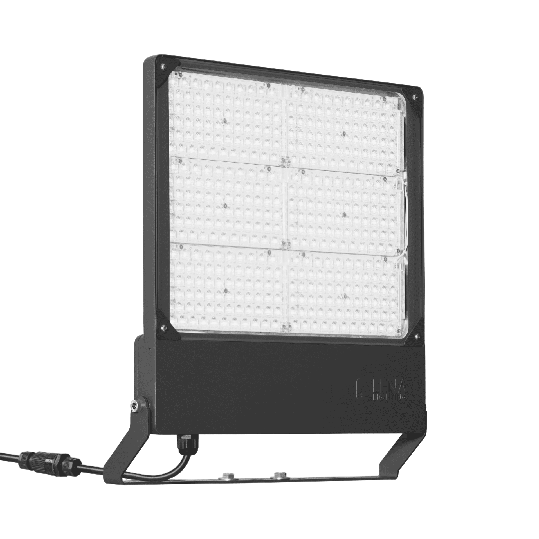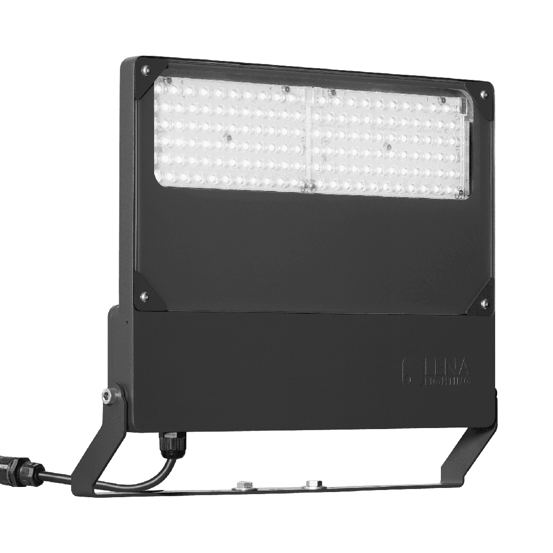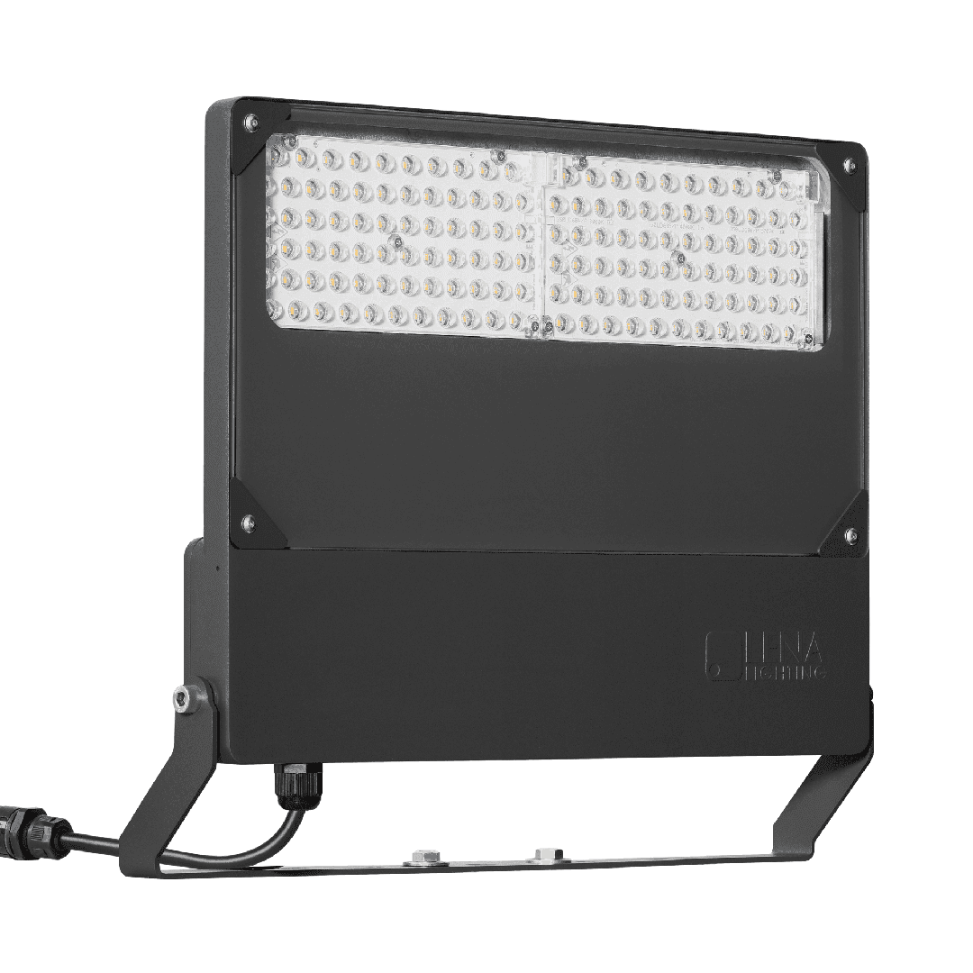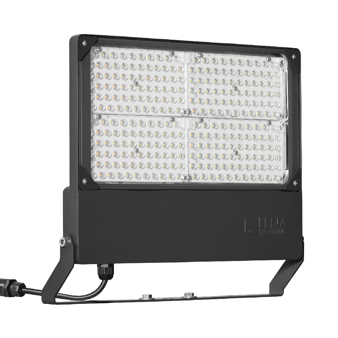 High-quality floodlight with inbuilt LED source. The body is made of die-cast aluminium, powder coated in anthracite grey (RAL 7016), and the mounting bracket is made of black-painted steel. The diffuser is made of 5 mm thick tempered glass. It is equipped with directional lens matrices with 3 different light distributions: symmetrical (120°), asymmetric narrow ASN and asymmetric wide ASW. Non-corrosive mounting bracket allowing for adjustment angles between -140° to +185°. The luminaire is available in 2 sizes: M and L. Standard equipped with 0.1m long H07RN-F cable and IP66 quick connector. Wide range of accessories available: protective net, grip for the lighting pole, wall bracket.