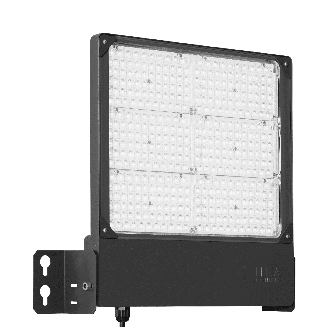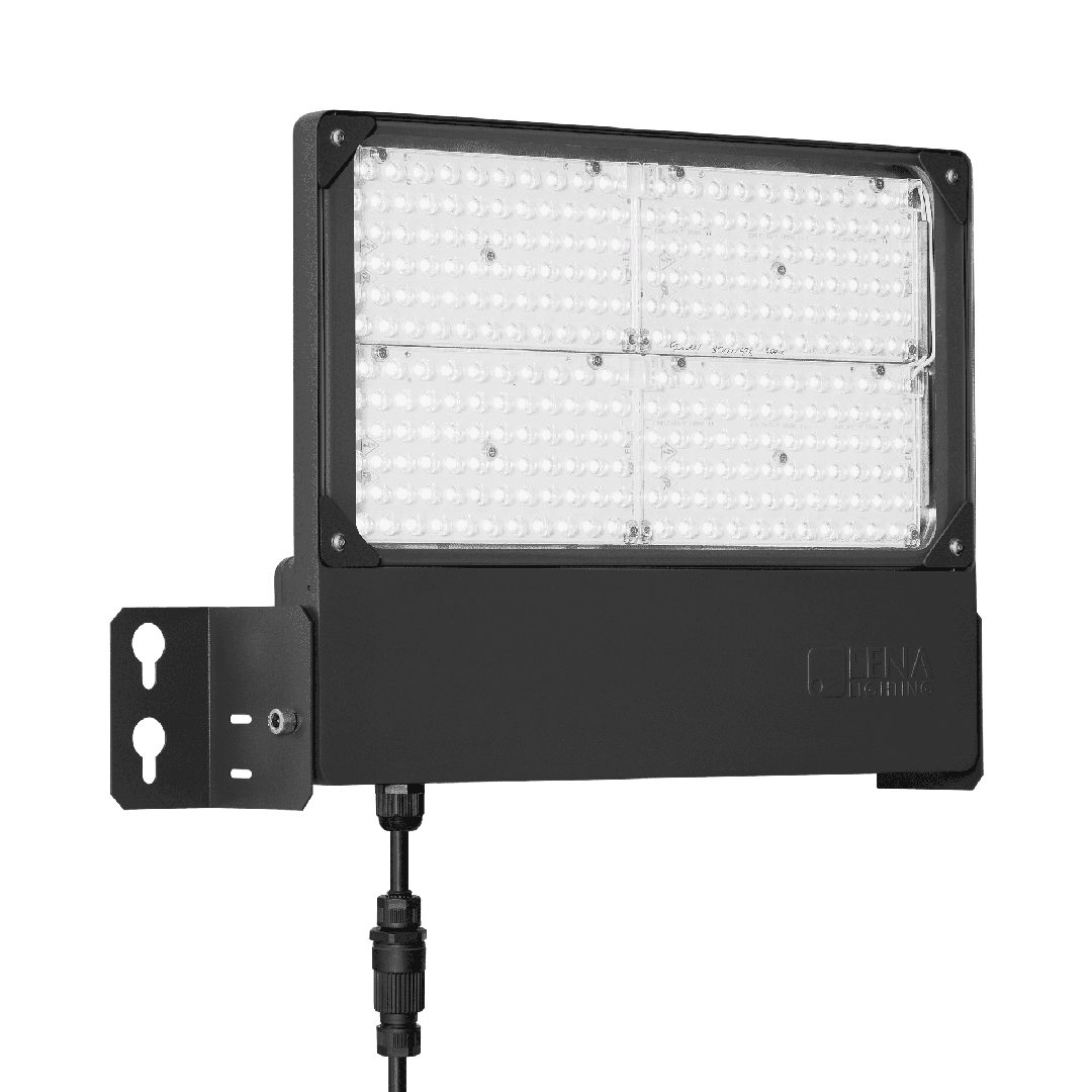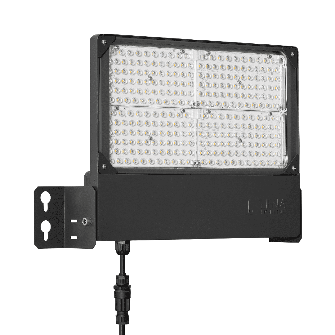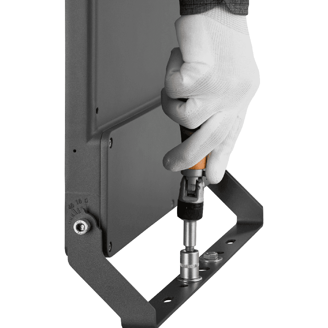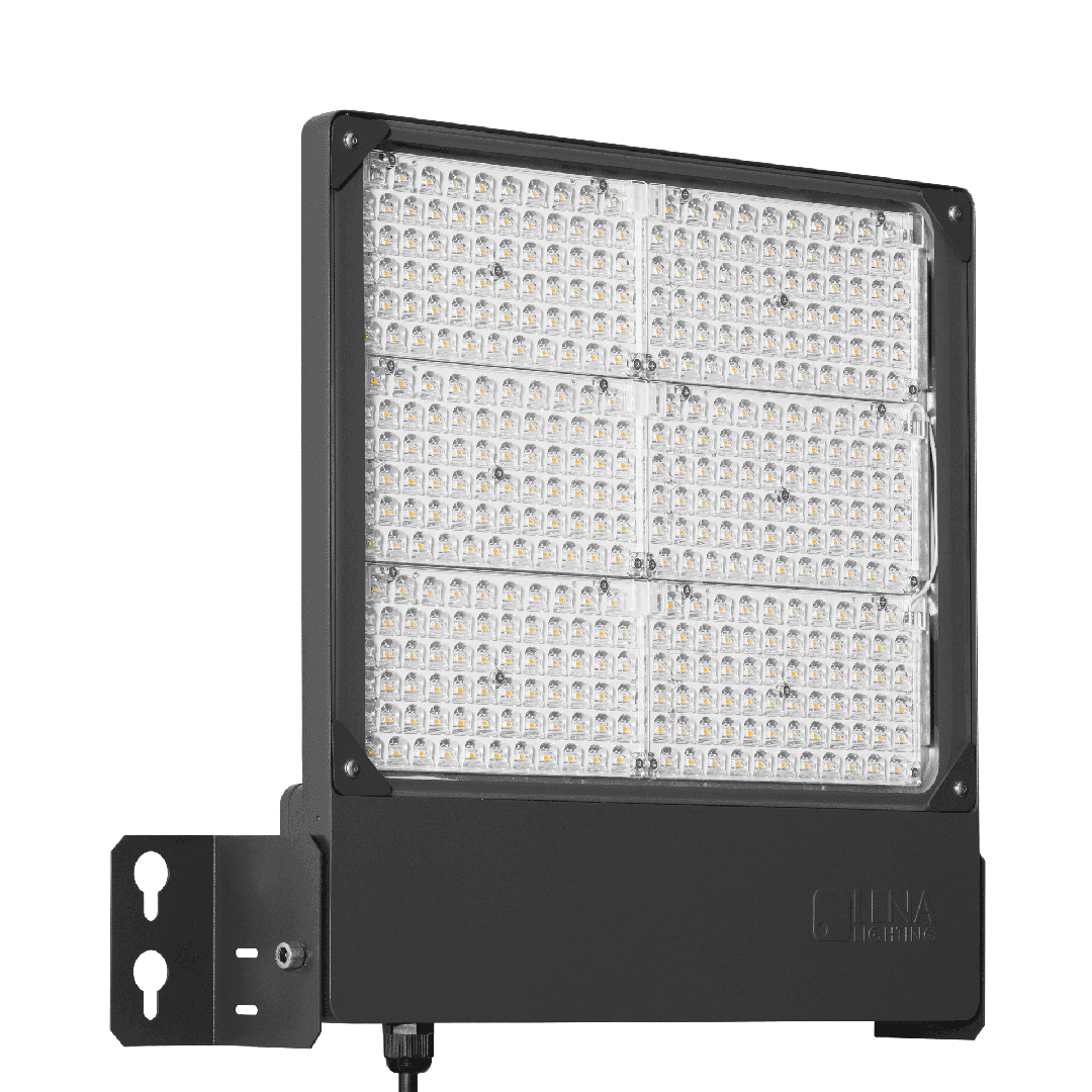 High-quality floodlight with inbuilt LED source. The body is made of die-cast aluminium, powder coated in anthracite grey (RAL 7016), and the mounting bracket is made of black-painted steel. The diffuser is made of 5 mm thick tempered glass. It is equipped with directional lens matrices with 3 different light distributions: symmetrical (120°), asymmetric narrow ASN and asymmetric wide ASW. Non-corrosive mounting bracket allowing for adjustment angles between -140° to +185°. The luminaire is available in 2 sizes: M and L. Standard equipped with 0.1m long H07RN-F cable and IP66 quick connector. Wide range of accessories available: protective net, grip for the lighting pole, wall bracket.