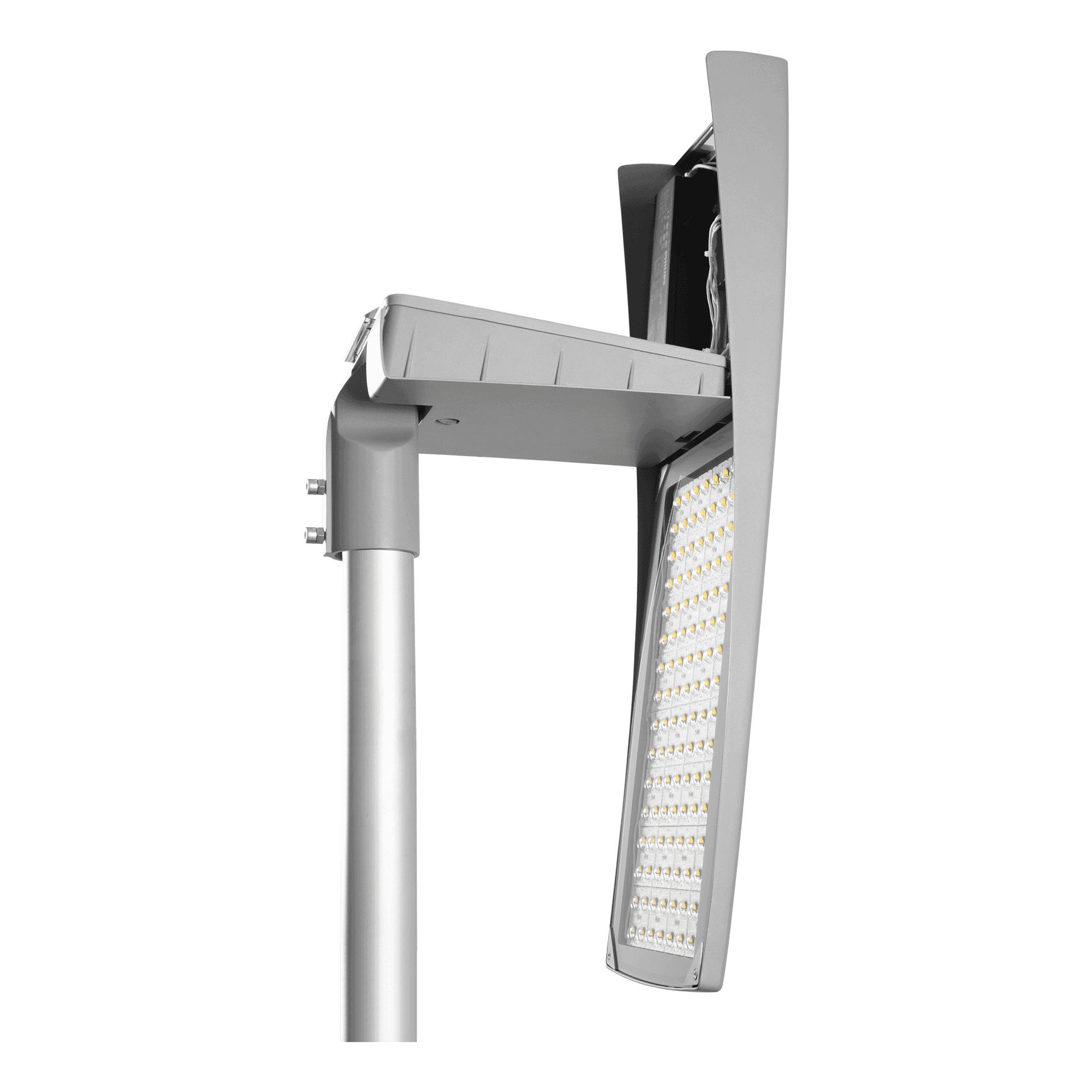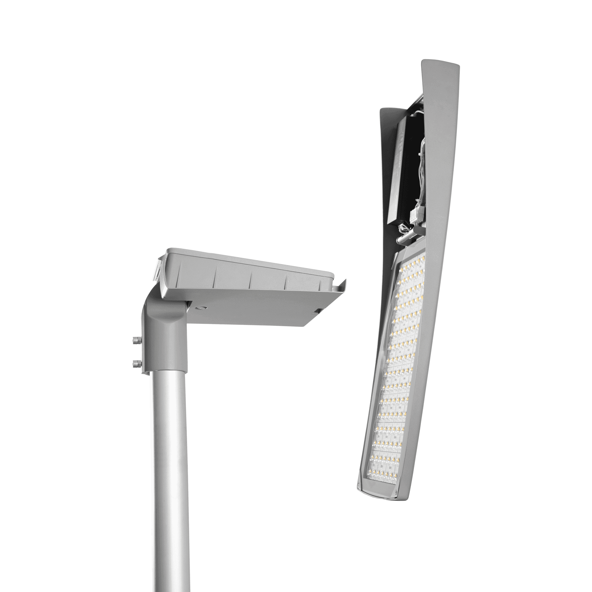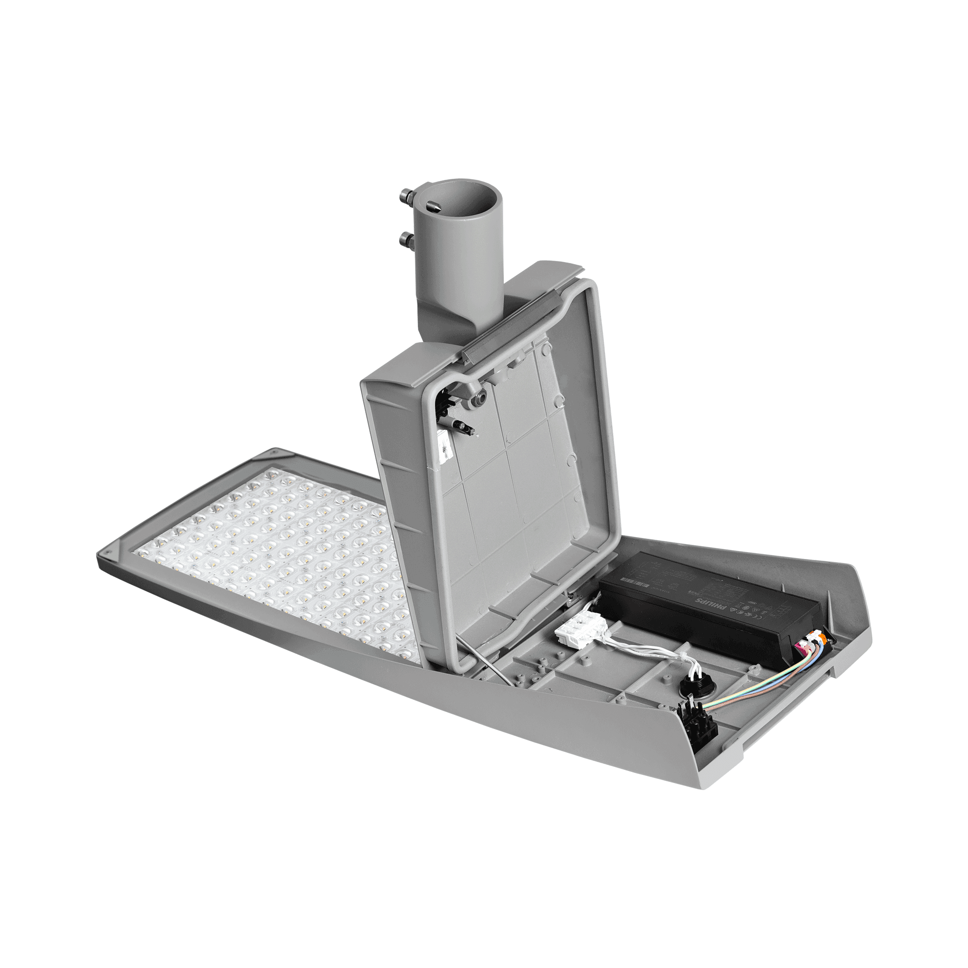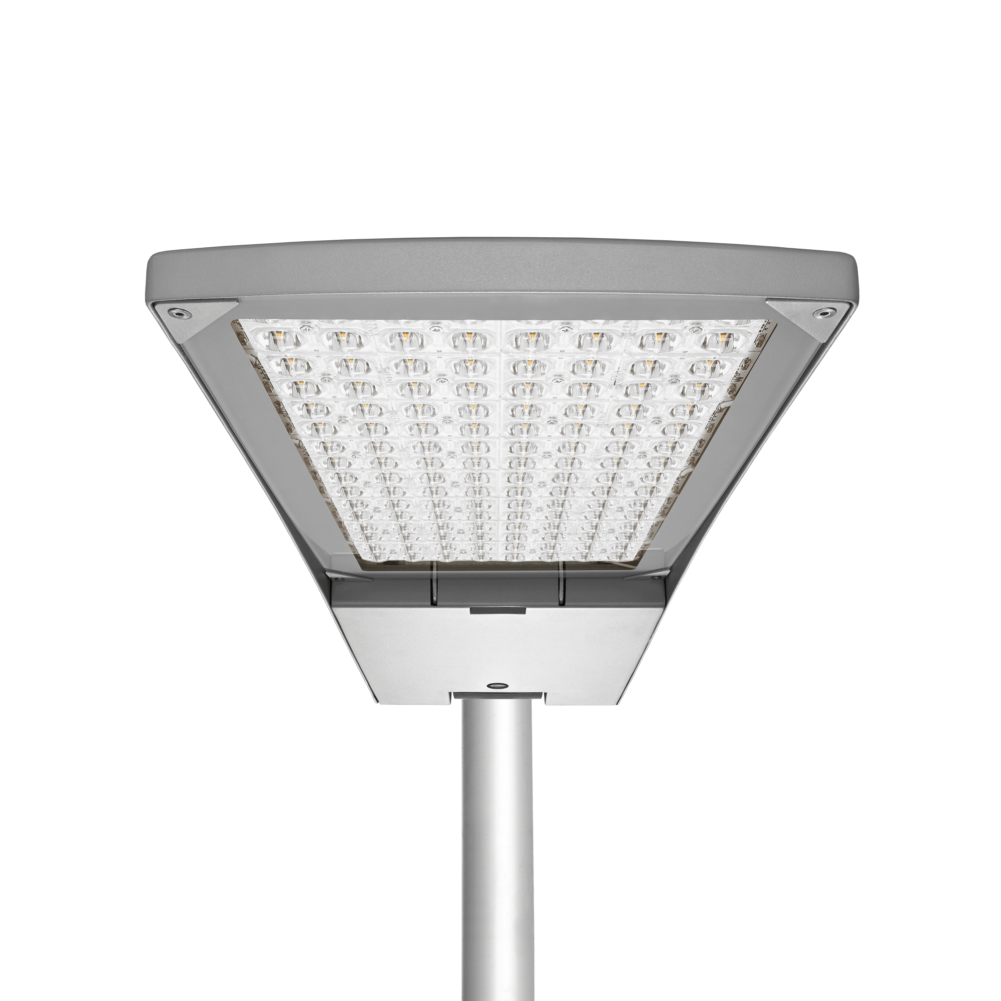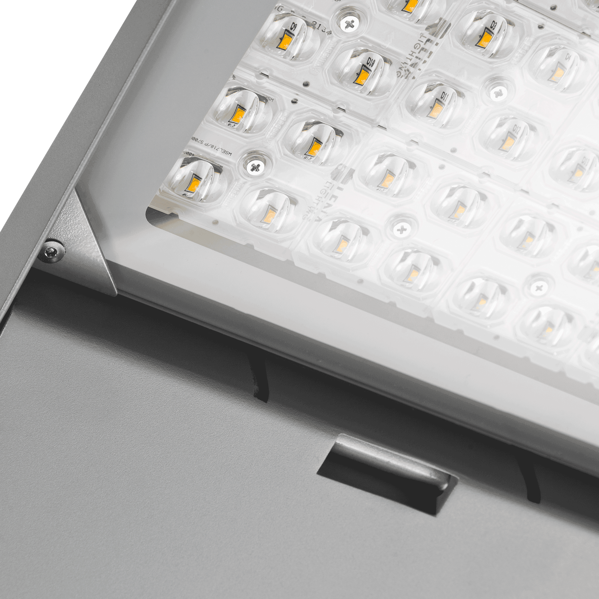 Tiara 2 LED L a family of LED road luminaires based on a proven form factor. It uses directional multi-lens matrices, made of PMMA, with each lens having the same optics, ensuring that the luminous characteristics remain constant over time. Components from renowned manufacturers and new LED panels contribute to the very high luminous efficacy achieved at the output of the luminaire - reaching 181 lm/W. The two-chamber construction of the luminaire maintains the tightness of the optical chamber during assembly work and allows tool-free access to the electrical equipment chamber. The upper part of the luminaire, has dedicated hinges and a safety cord. Using standard tools, quick and convenient servicing is possible, allowing the replacement of any component without having to dismantle the entire luminaire and make soldered connections. The body and handle are made of die-cast aluminium, powder-coated grey, and have a very high IP66 protection rating and IK09 mechanical impact resistance.